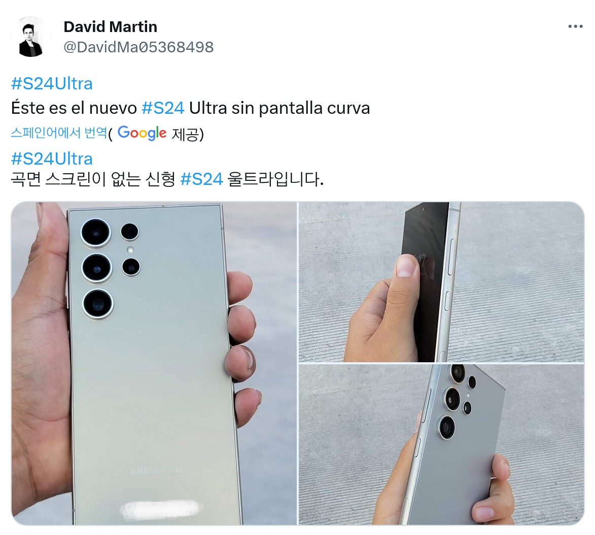 X의 @DavidMa05368498 계정으로 올라온 트윗에 따르면 커브드 디스플레이(엣지 디스플레이)가 아닌 평평한 플랫 스크린을 채용한 갤럭시 S24 울트라의 사진이라고 합니다.