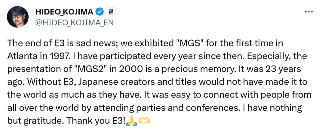 이 소식에 유명 게임 개발자인 코지마 히데오는 1997년과 2000년 E3에서 메탈 기어 솔리드와 메탈 기어 솔리드 2를 선보였던 기억을 회상하며 일본 게임 개발자로 하여금 세계와 연결할 수 있는 기회를 주었다며 감사를 표하기도 했습니다.