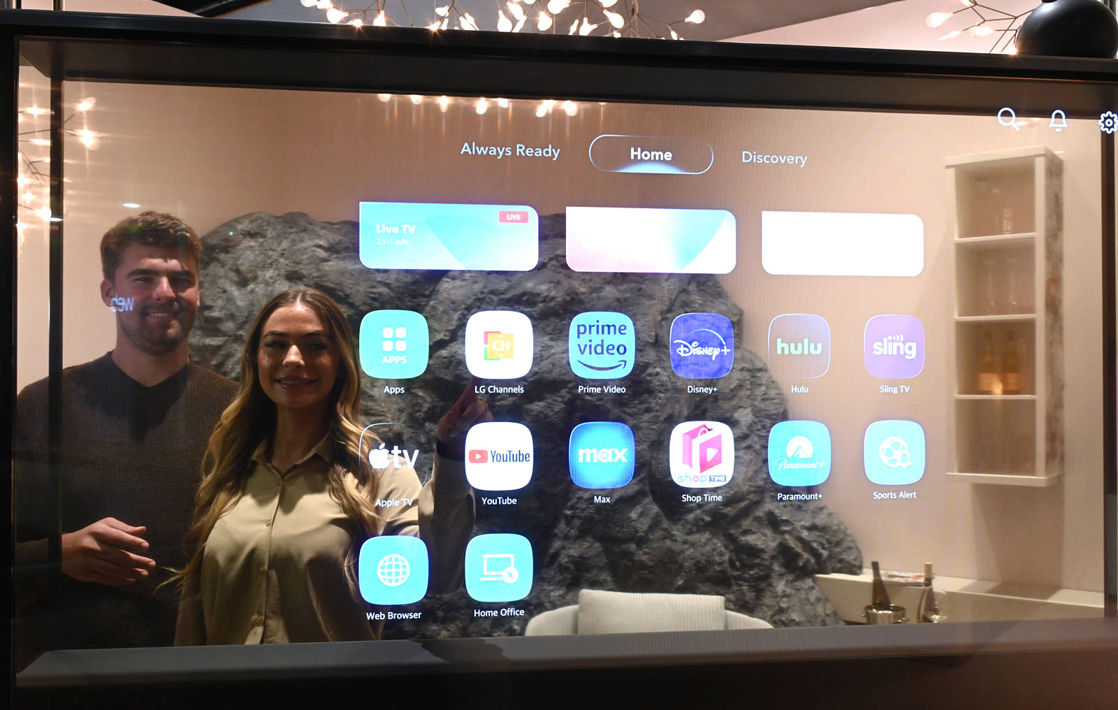 LG 시그니처 올레드 T를 위해 특별히 투명한 배경을 잘 활용할 수 있게 UI가 최적화된 webOS 화면입니다. 화면 너머로 모델들이 보이네요.