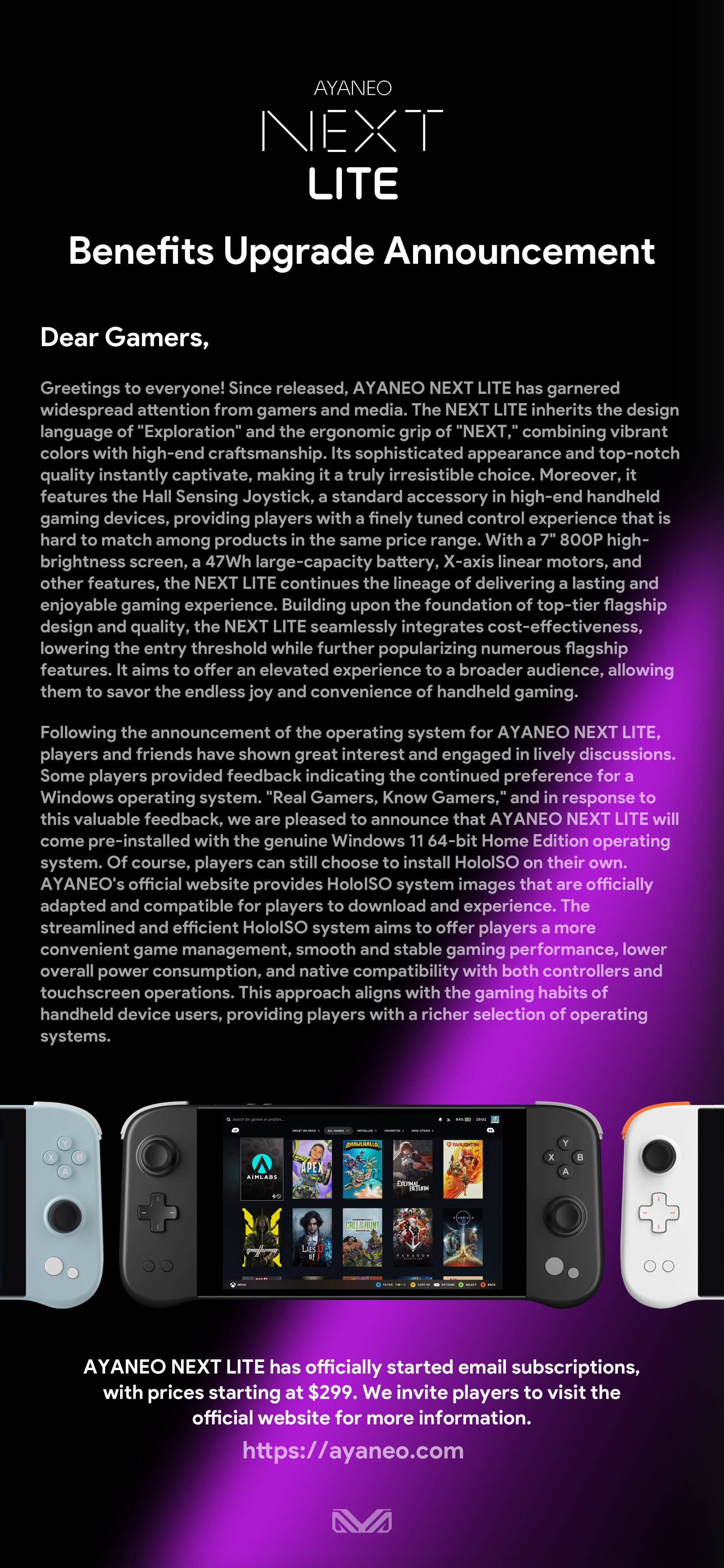 아야네오 측의 발표에 따르면 게이머들의 의견에 따라 아야네오 넥스트 라이트 또한 다른 아야네오의 UMPC와 마찬가지로 윈도우 11을 기본 탑재하기로 결정했다고 합니다. 그리고 스팀OS를 원하는 이용자들을 위해 아야네오 넥스트 라이트를 위한 HoloISO 또한 아야네오 공식 사이트를 통해 다운로드 받아 설치할 수 있다고 하네요.