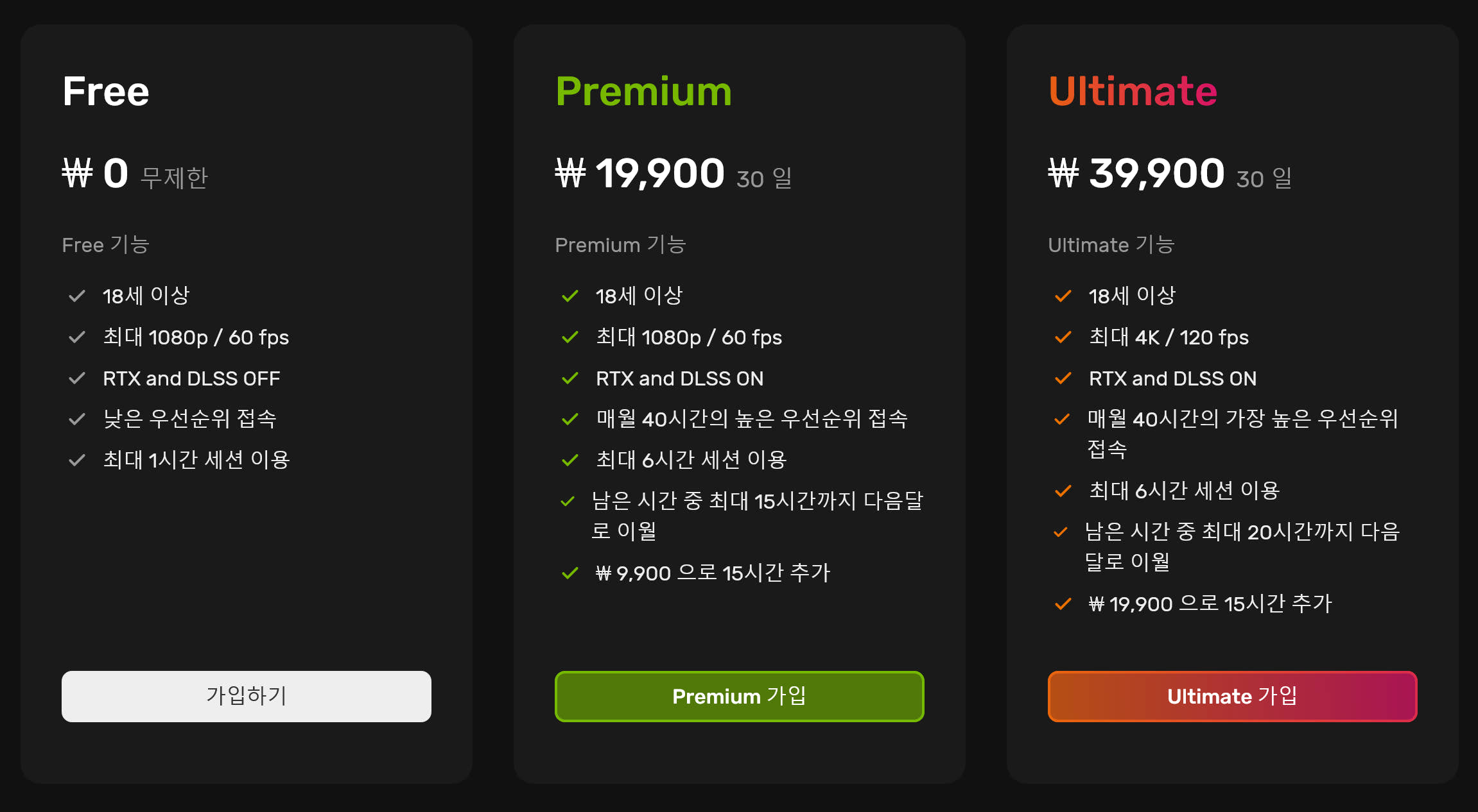 지포스 나우가 좀 애매한 게임 스트리밍 서비스이긴 한데, 무료 요금제에 광고를 넣는다는 건 어느 정도 이해되는 부분입니다. 다만 기왕 광고 넣는 거 기존의 제약을 좀 풀어주는 것도 좋을텐데 말이죠. 참고로 현재 국내에 서비스되는 지포스 나우의 요금제와 금액은 다음과 같습니다.
