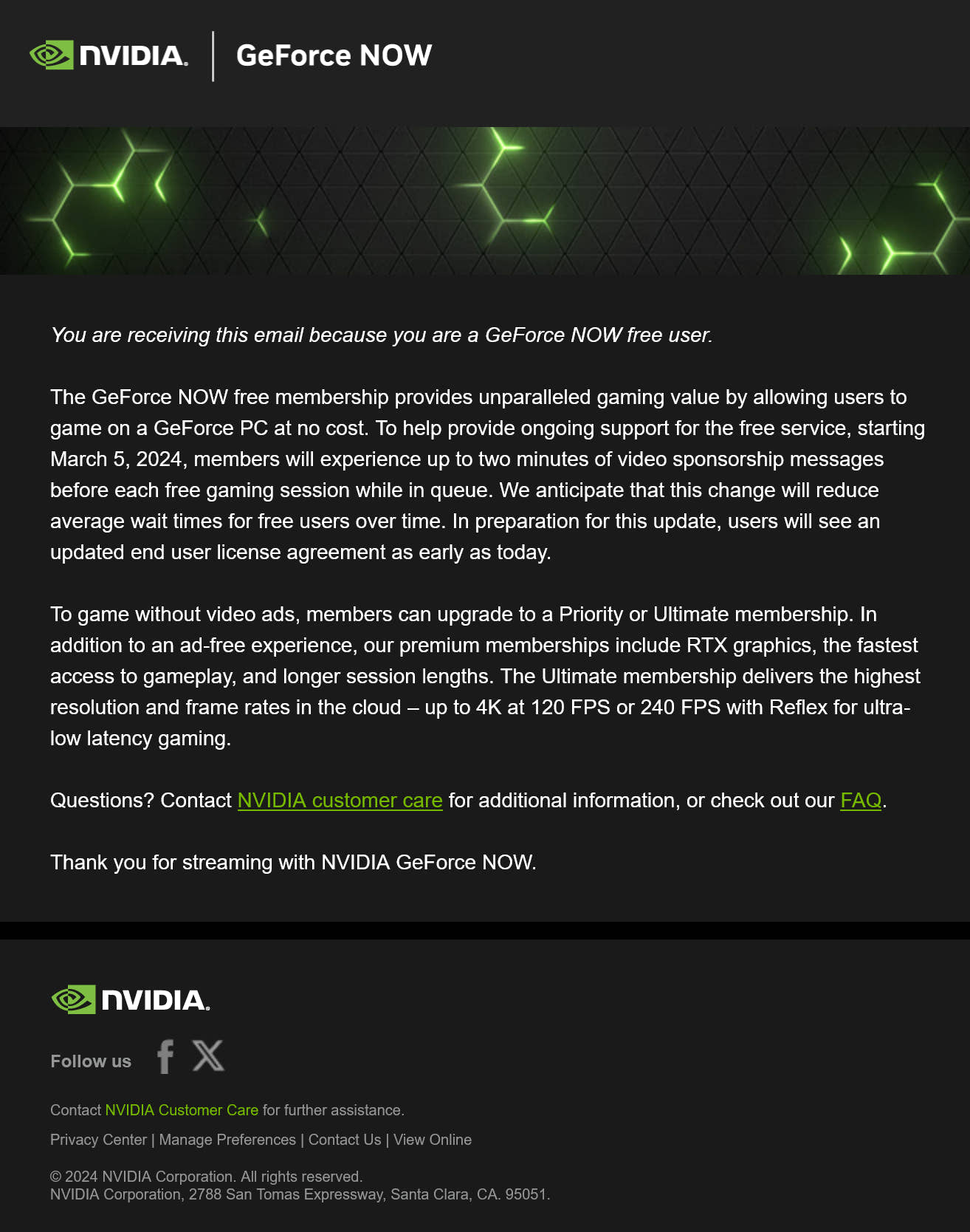 엔비디아는 지포스 나우 프리 요금제 이용자에게 게임 시작 전 최대 2분까지의 동영상 광고를 보게 된다고 e메일을 통해 공지했습니다. 이러한 변화는 3월 5일부터 시작하며, 이 광고를 보기 싫다면 유료 요금제에 가입하기를 권유했습니다.