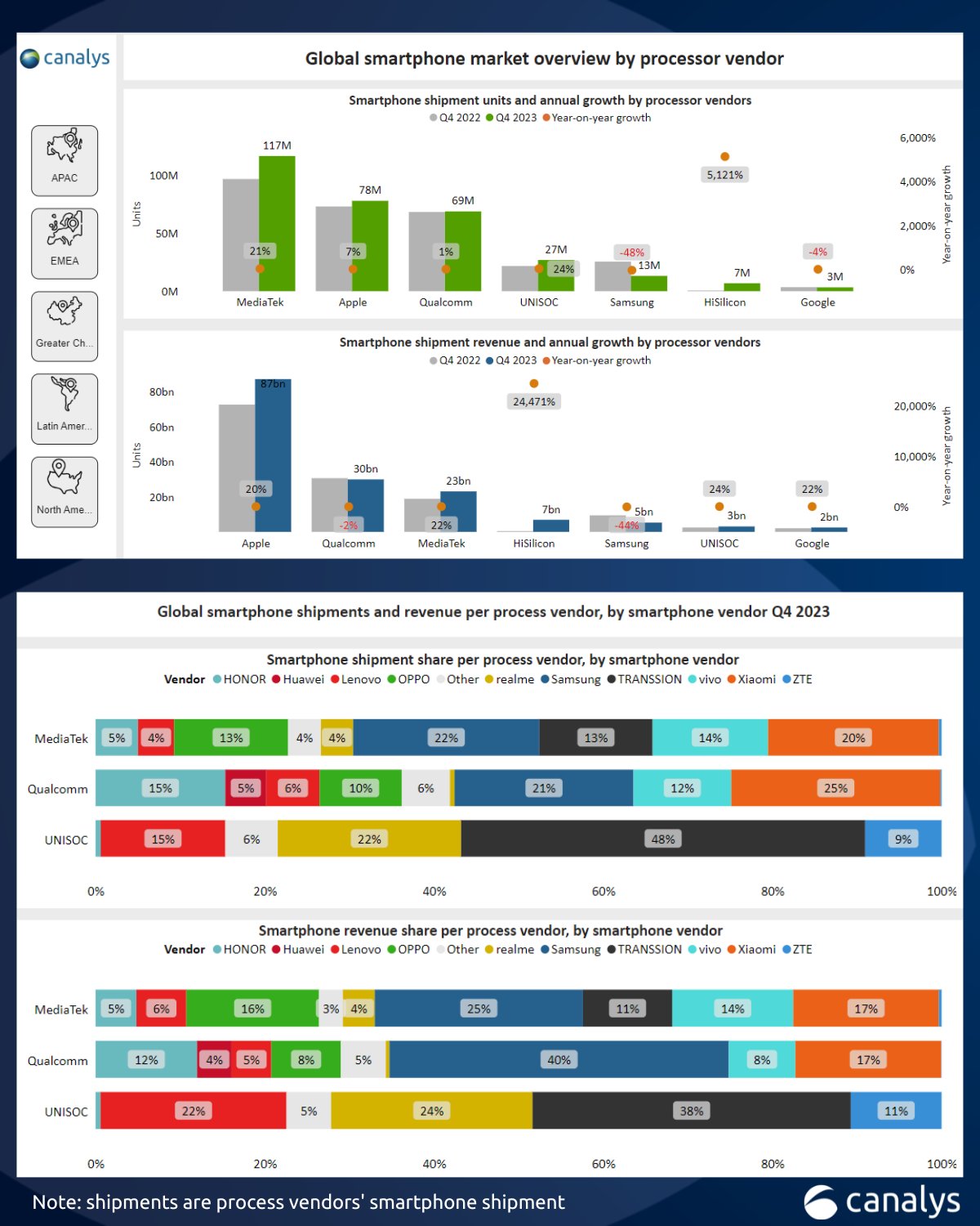 시장조사기업인 Canalys에서 2023년 글로벌 스마트폰 시장에서의 프로세서 판매에 대한 자료를 발표했습니다.