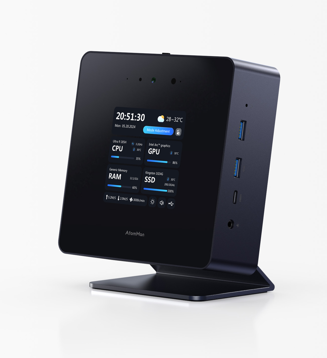 미니스포럼의 하이엔드 브랜드인 아톰맨(AtomMan)으로 나오는 X7 Ti의 특징은 미니PC임에도 불구하고 4인치 터치스크린이 달려있다는 점입니다. 이걸로 대단한 작업을 한다기 보다는 시스템 모니터링, 성능 조절, 시간 표시에 테마 전환도 가능하다고 합니다.