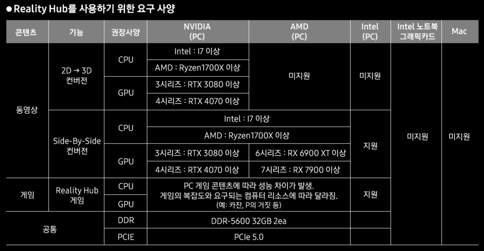 오디세이 3D라고 3D를 아무 제약없이 보여주는 것은 아닙니다. 삼성전자의 상품 페이지에 올라온 내용에 따르면 우선 3D 기능 및 리얼리티 허브 관련하여 다음과 같은 제한이 있습니다.