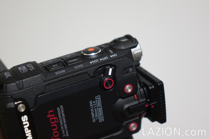 플래시 양 옆으로 스테레오 마이크가 내장되어 있습니다. 액션캠 써보신 분들은 알겠지만 액션캠이라 해도 수심 10미터 정도까지의 방수 능력을 가진 경우에는 별도의 방수 하우징을 써야하고 그 경우 마이크의 수음 능력이 많이 떨어집니다만, TG-트래커는 본체만으로도 수심 30미터까지 방수/방진 능력을 갖고 있고 마이크를 그대로 잘 쓸 수 있습니다.