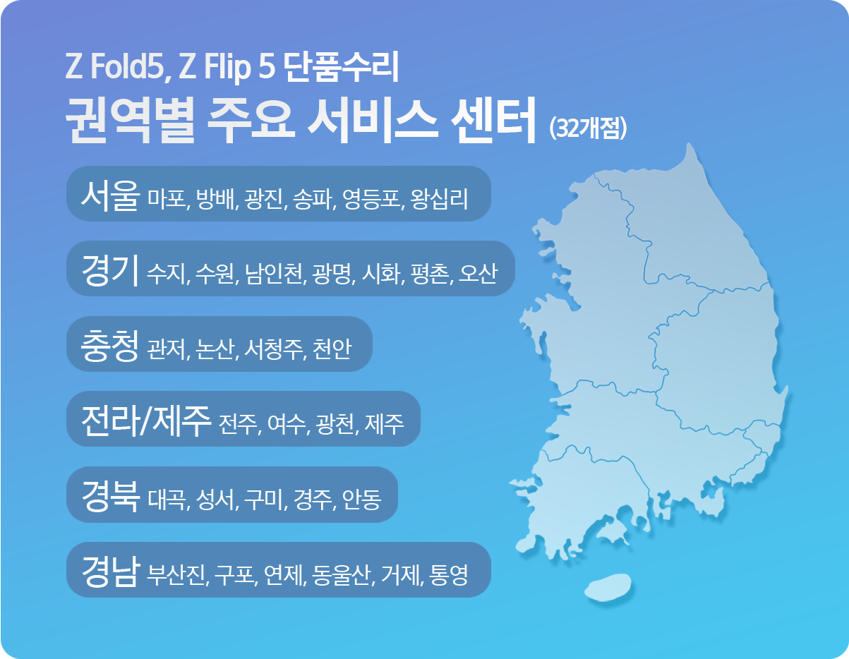 최신 폴더블폰인 갤럭시Z 플립·폴드 5의 경우 6월 3일부터 디스플레이 단품 수리 서비스센터를 전국 13곳에서 32곳으로 확대합니다. 세부 현황은 삼성전자서비스 홈페이지에 공지되었으니 궁금하신 분은 방문해 보시기 바랍니다.
