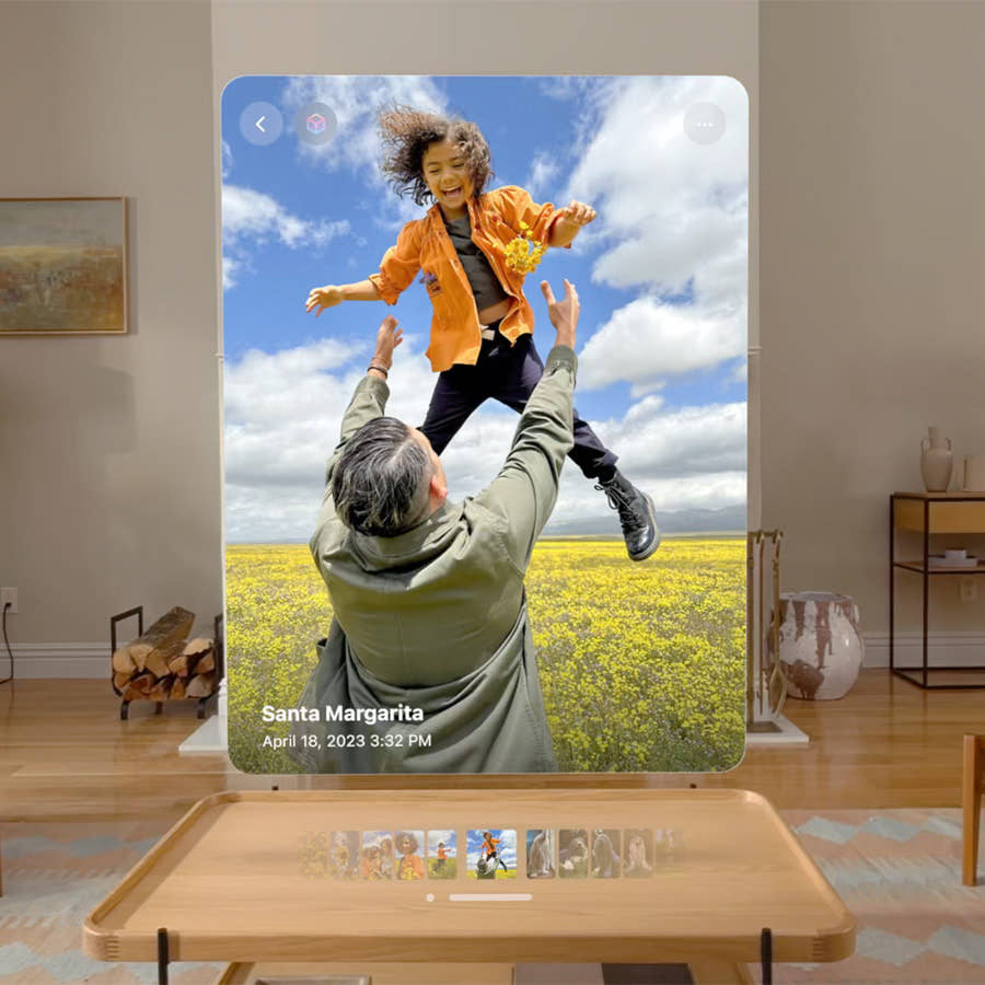머신 러닝으로 2D 이미지를 비전 프로를 위한 공간 사진으로 변환할 수 있습니다. 사용자는 가족 및 친구들이 비전 프로에서 공간 사진을 공유하거나 사진 앱에서 SharePlay를 사용하면 각자의 공간 Persona로 원하는 추억을 같은 공간에서 보는 듯한 경험을 즐길 수 있습니다.